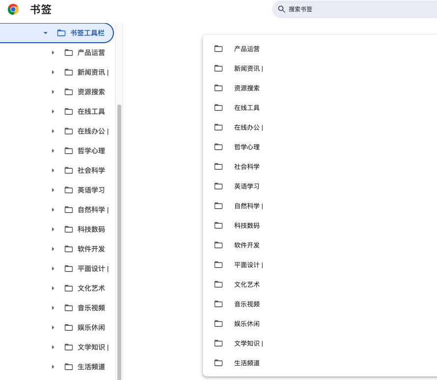 这是目前最新的版本,共有书签 6200 多个,涵盖:产品运营、新闻资讯、资源搜索、在线工具、在线办公、哲学心理等非常多领域,并做了细分。